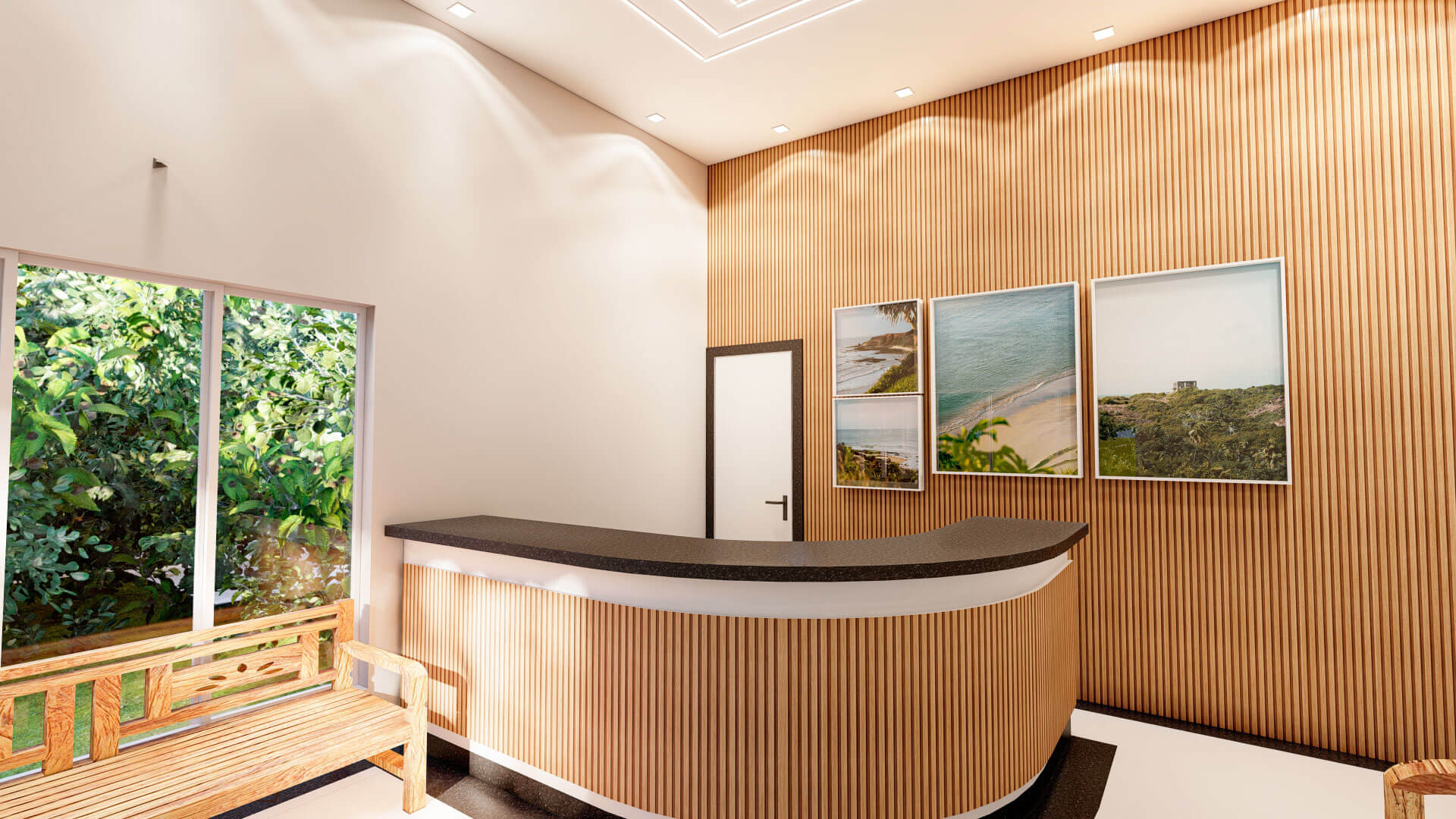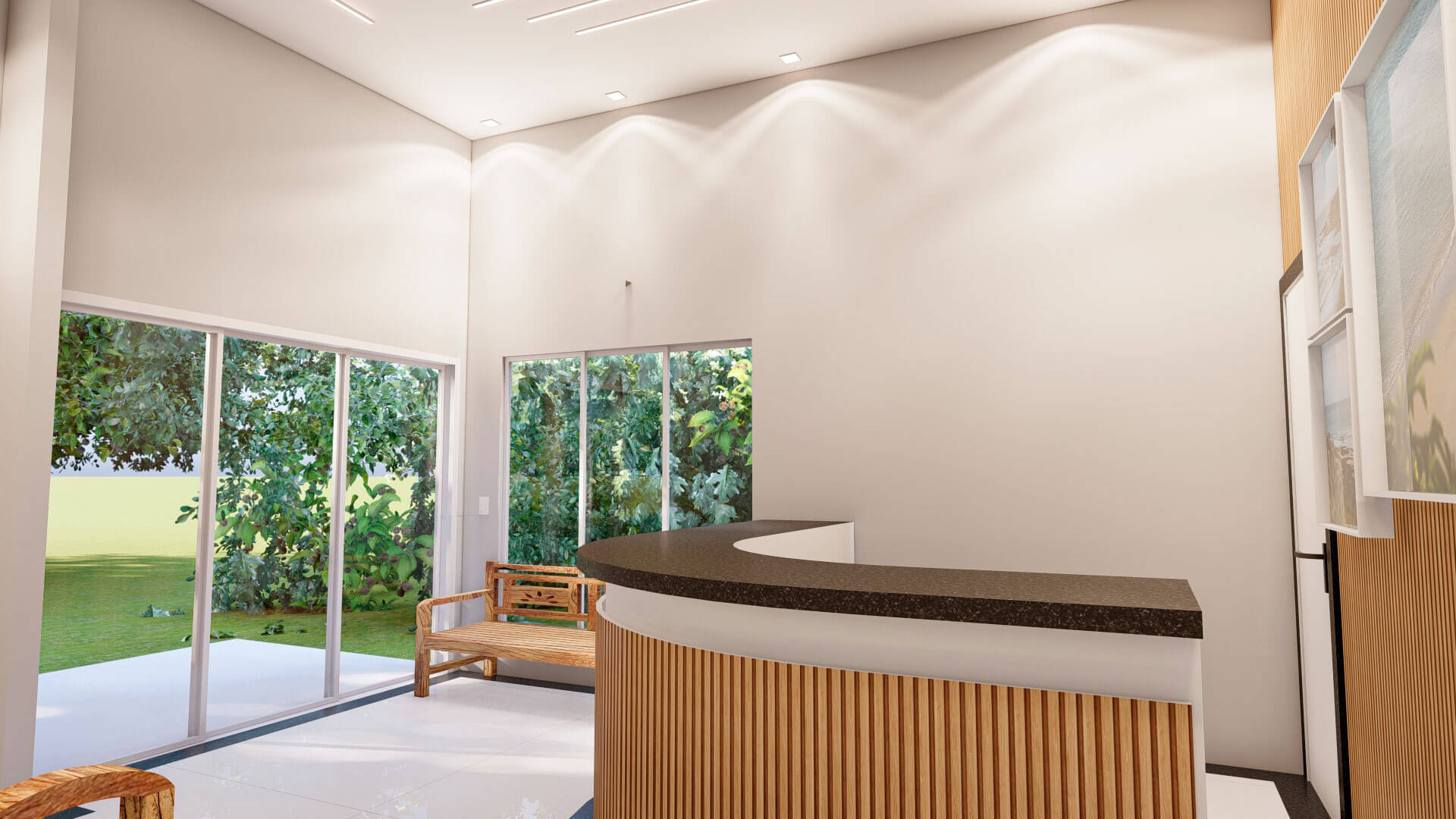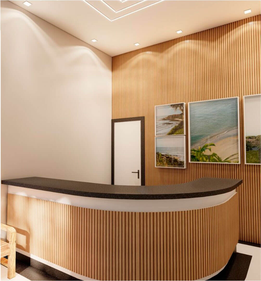 A iluminação foi uma parte essencial dessa reforma. A substituição das luzes de tonalidade Branca Fria por iluminação mais quente foi uma escolha deliberada para trazer aconchego e conforto ao ambiente. Essa alteração teve um impacto profundo na atmosfera, tornando a recepção mais acolhedora e convidativa para os hóspedes.