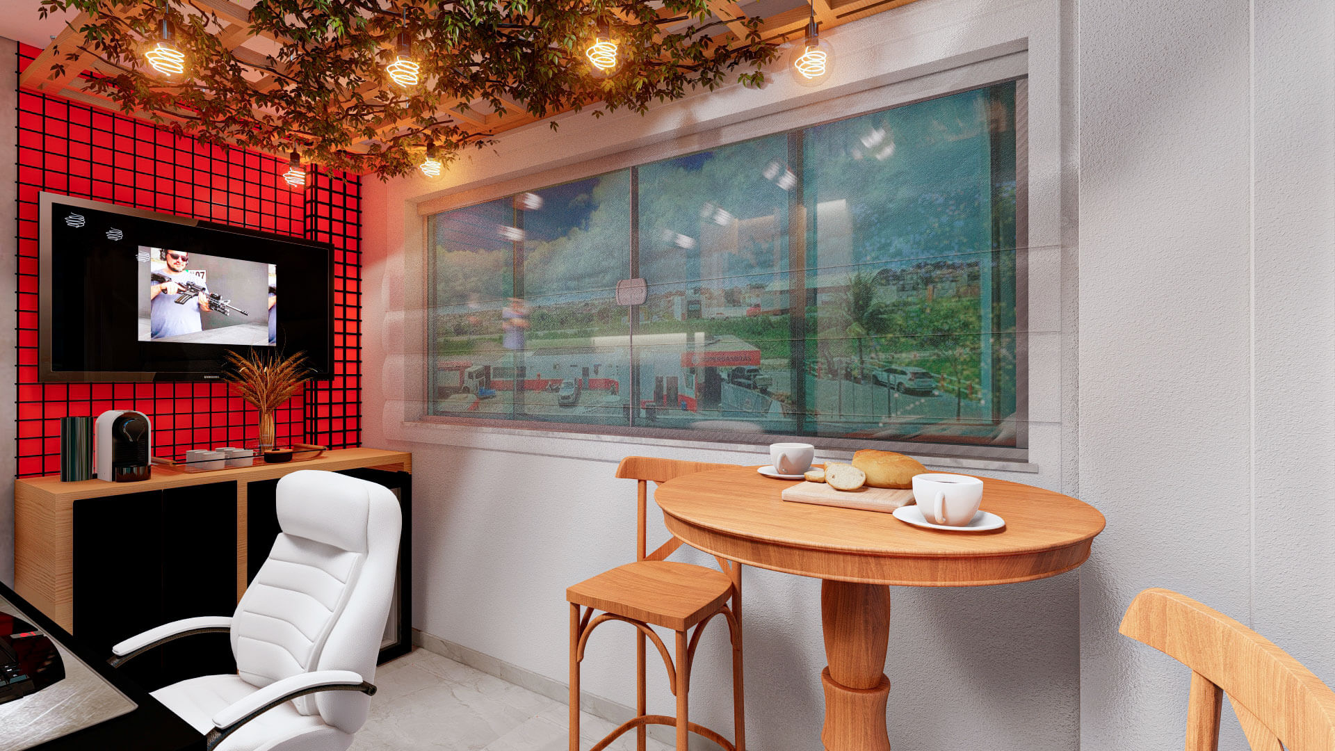 Na paleta de cores, trouxemos as cores da marca para dentro do mobiliário e inovamos com um belo pergolado acima do lounge com vegetação e luzes em bulbo de led com 2700k de temperatura.