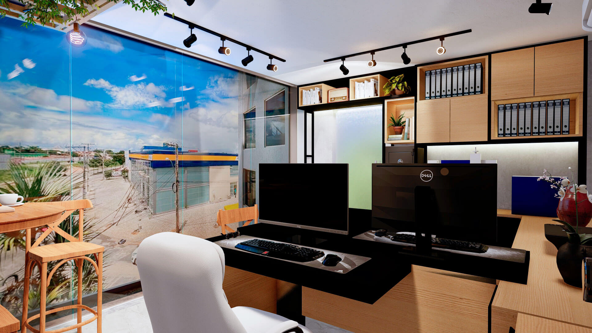 Criamos duas estações de trabalho de forma nada convencional, com bastante armazenamento e espaço para assinar os contratos. E também criamos um Lounge para os clientes tomarem aquele cafézinho durante as reuniões.